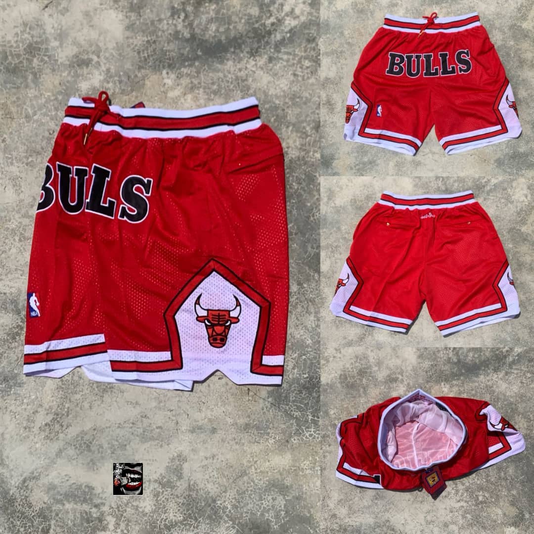 These are Chicago Bulls basketball shorts featuring a red design with black and white accents. The shorts display the “BULLS” wordmark in bold black letters across the front, along with the iconic Bulls logo on the lower right side. They include an NBA logo patch on the left leg and have a drawstring waistband with […]